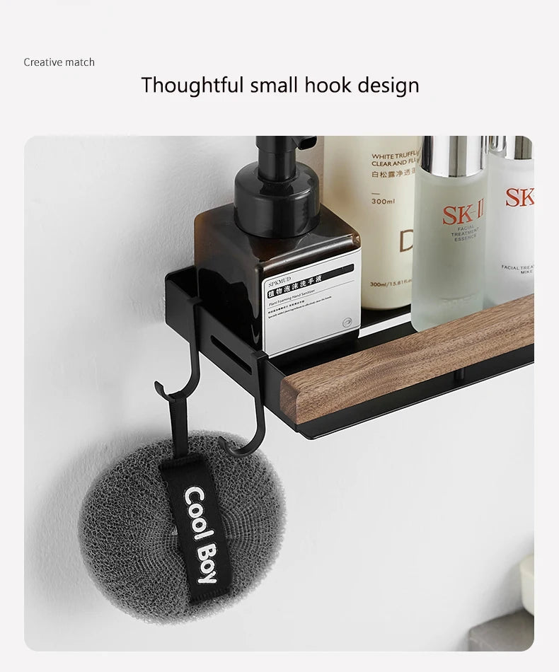 Étagère d’Angle de Salle de Bain TOLM – Aluminium et Bois, Finition Noire Élégante